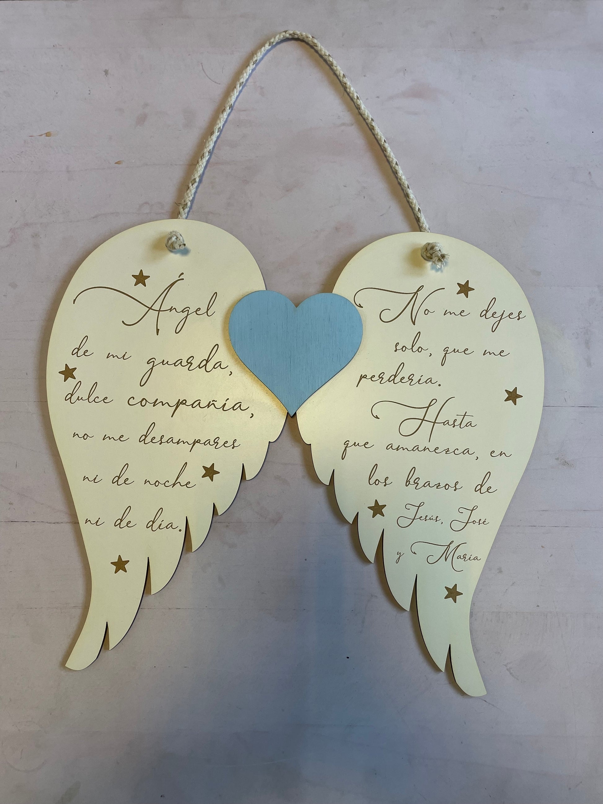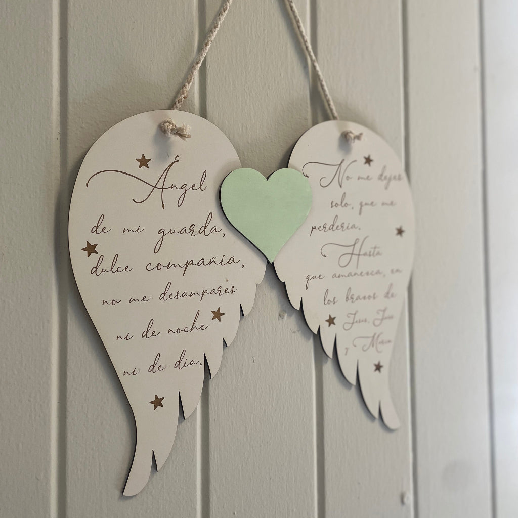Cuadro Decorativo con la Oración del Ángel de la Guarda. Este elegante cuadro, realizado en Durolac blanco con grabado láser, es una pieza ideal para decorar cualquier espacio con un toque de fe y serenidad.